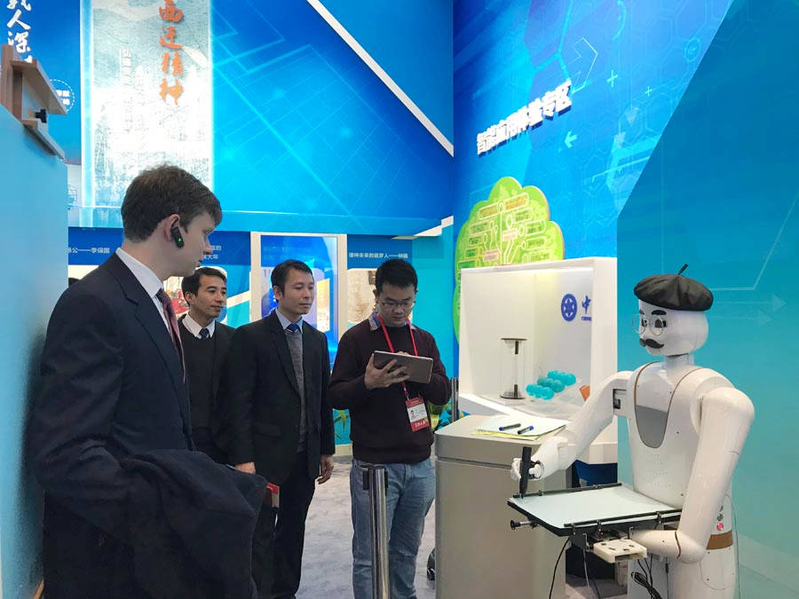 A foreign visitor stands in front of a robot artist before it draws his portrait at an interactive zone at the National Museum of China on Nov 19, 2018. [Photo by Li Ping/chinadaily.com.cn]