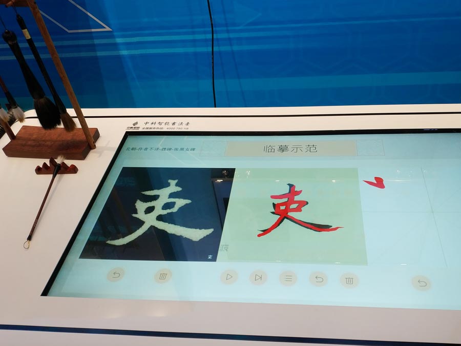 Traditional Chinese calligraphy going digital. On a digital tablet, visitors write Chinese characters using a brush. [Photo by Wang Xuquan/chinadaily.com.cn]