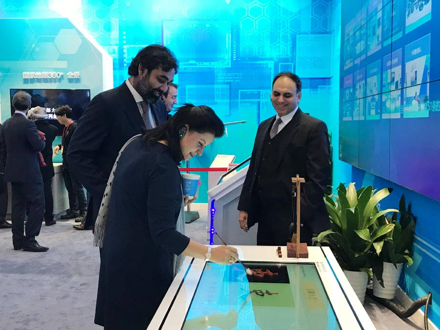 A foreign visitor writes Chinese calligraphy on a digital writing board at the National Museum of China on Nov 19, 2018. [Photo by Li Ping/chinadaily.com.cn]