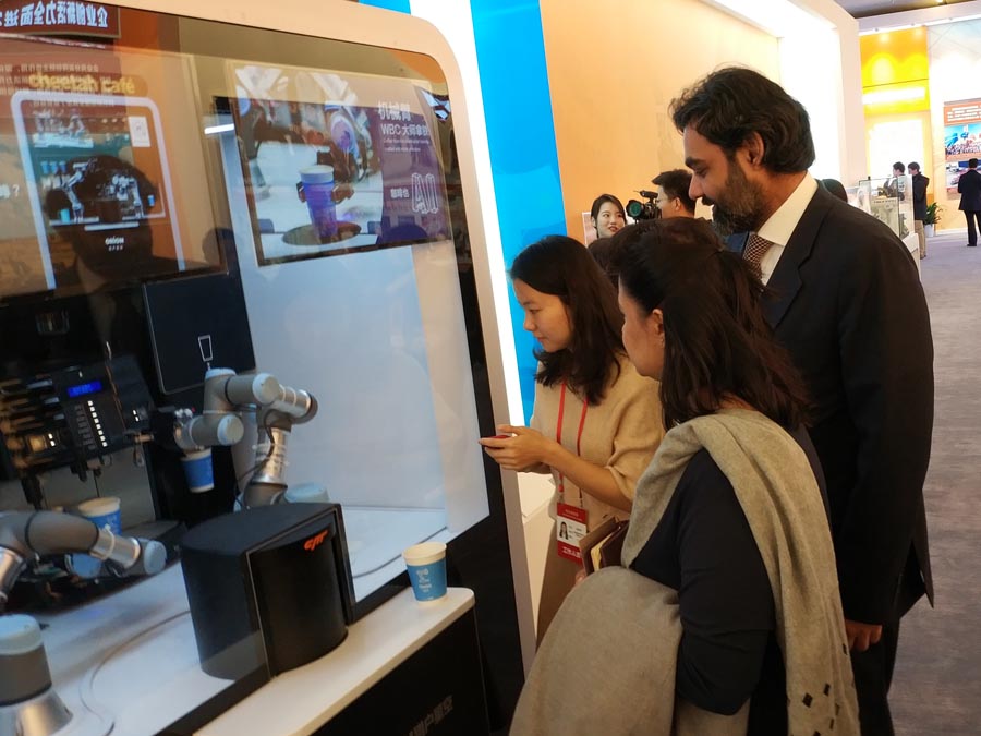 Another robot makes coffee for visitors at the National Museum of China on Nov 19, 2018. [Photo by Wang Xuquan/chinadaily.com.cn]