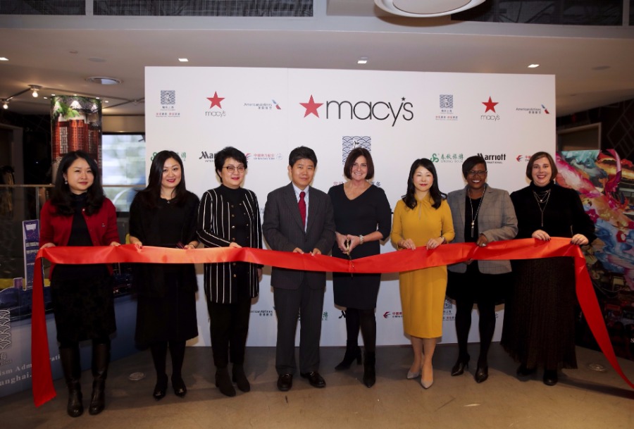 Guests cut the ribbon during the opening ceremony of the Shanghai Food Festival and Tourism Promotion at Macy's flagship store in New York, the United States, Nov. 19, 2018.Themed "Eat, Love, Shanghai", the three-day event kicked off here on Monday, aiming to attract more American tourists to Shanghai by introducing its unique culinary culture. [Photo/Xinhua] |