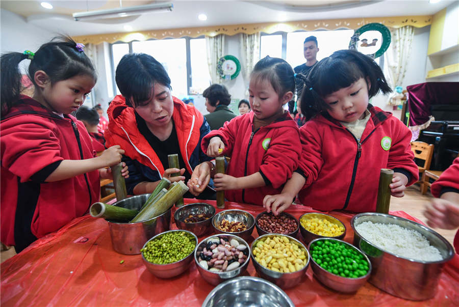 Children use azuki bean, corn and glutinous rice to make a kind of traditional food during an activity at a kindergarten in Lijiaxiang township of Changxing county, East China's Zhejiang province, Nov 21, 2018. [Photo/Xinhua]