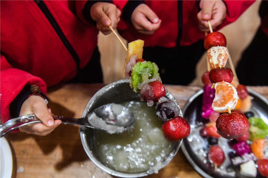Children use orange, hawthorn and other fruits to make a kind of traditional food during an activity held at a kindergarten in Lijiaxiang township of Changxing county, East China's Zhejiang province, Nov 21, 2018. [Photo/Xinhua]