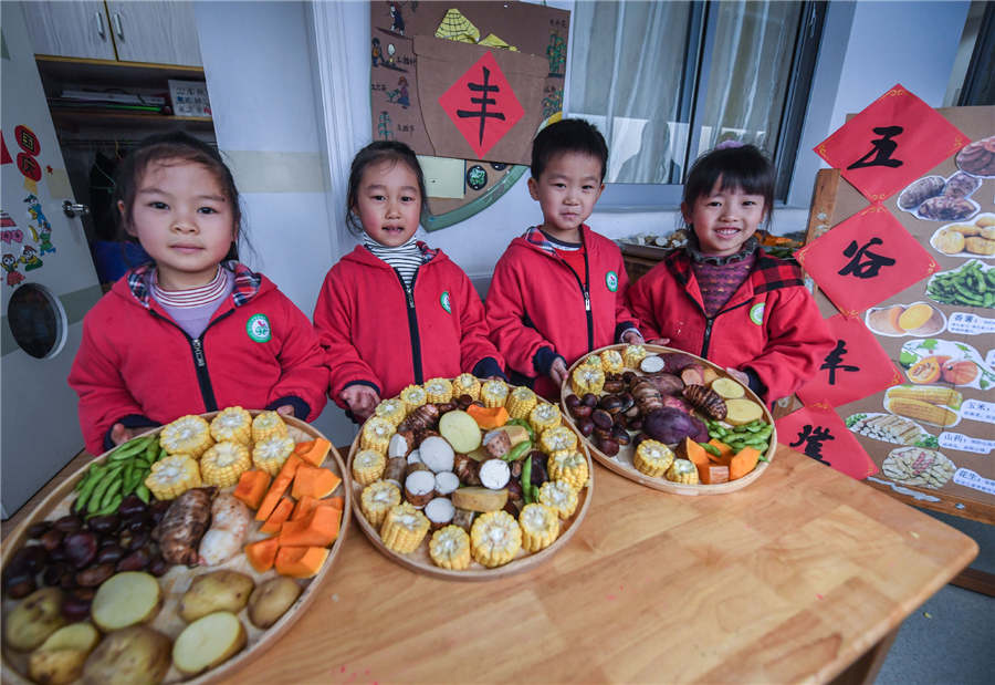 Children make traditional food during an activity at a kindergarten in Lijiaxiang township of Changxing county, East China's Zhejiang province, Nov 21, 2018. [Photo/Xinhua]