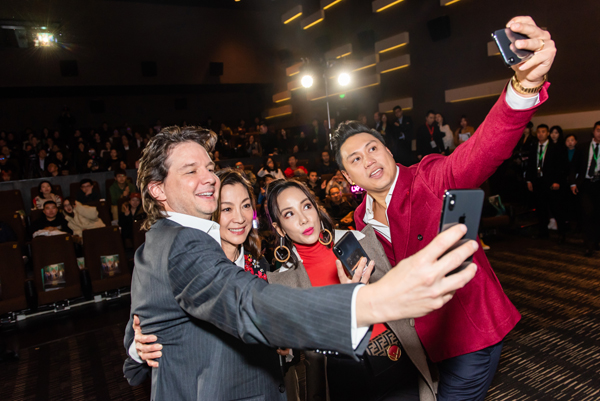 From left: The film's producer John Penotti, actresses Michelle Yeoh Choo Kheng and Fiona Xie and director Jon M. Chu take selfies with audiences during the Beijing promotional event. [Photo provided to China Daily] |