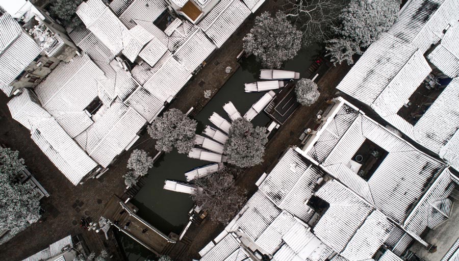Aerial photo taken on Dec 9, 2018 shows snow scenery in Tongli ancient town, Suzhou city, East China's Jiangsu province. [Photo/Xinhua]