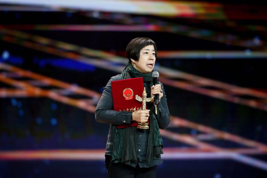 Director Miao Yue delivers a speech after winning the best scriptwriter for Hold Your Hands. [Photo provided to China Daily] |