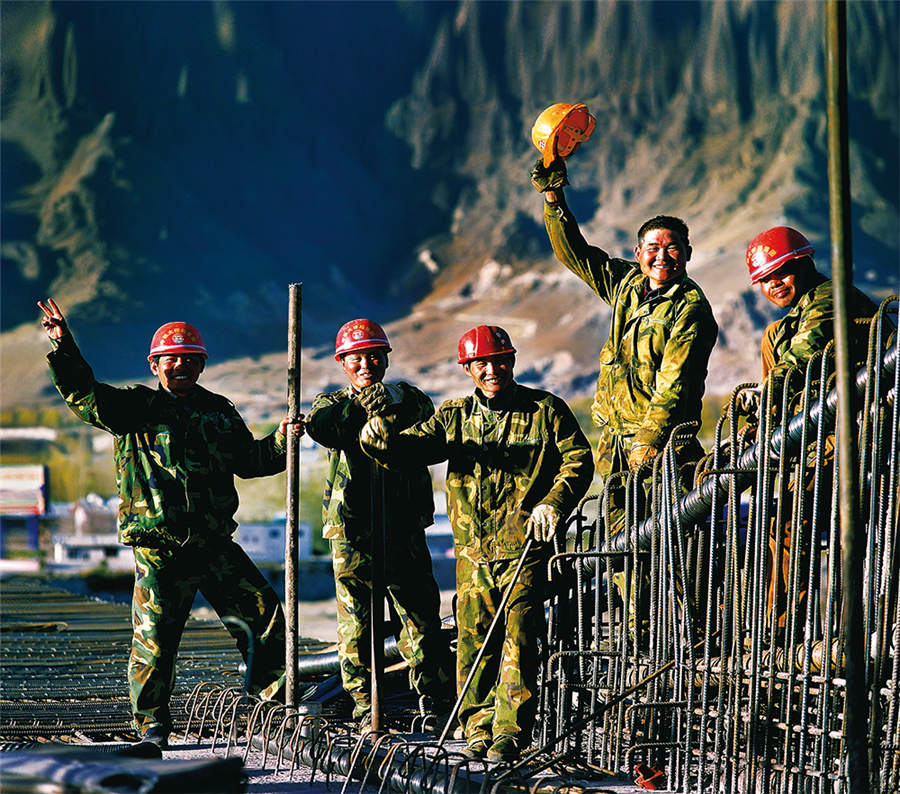 Workers pause for a moment during the construction of the Qinghai-Tibet Railway in 2004. [Photo by Zou Yi/cpanet.org.cn]