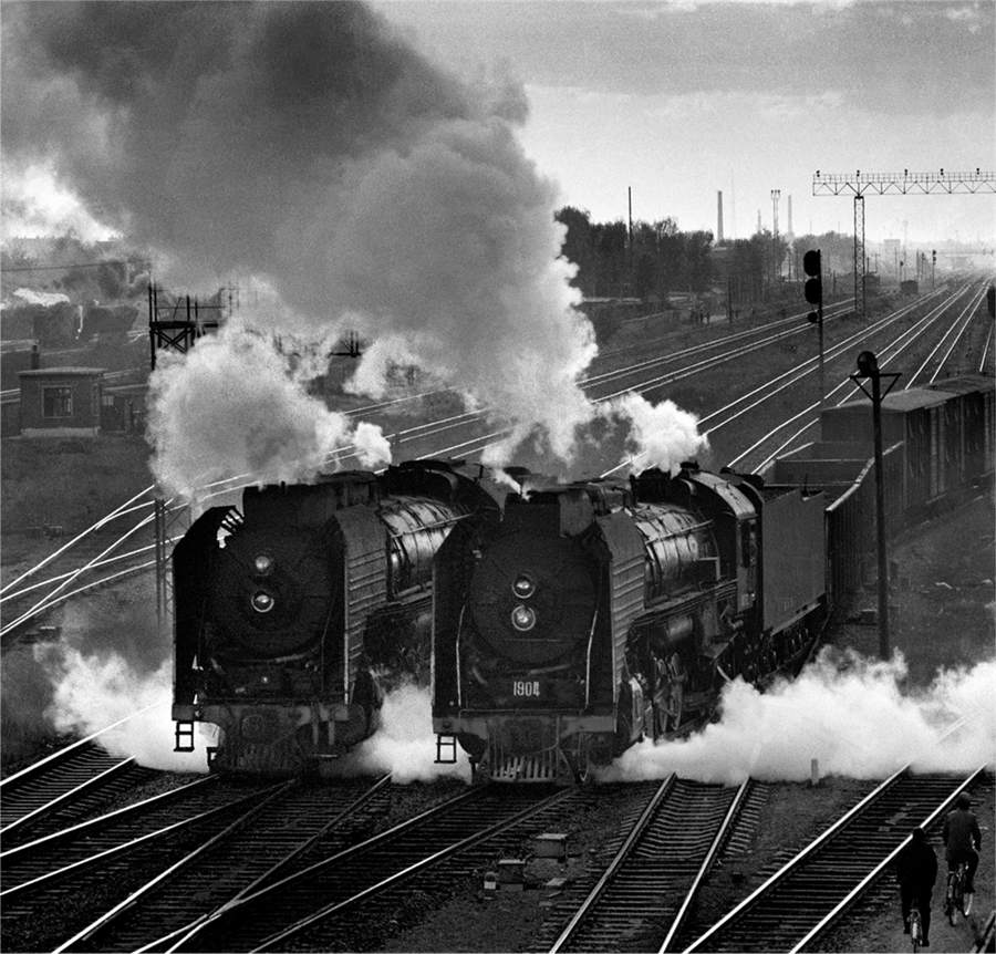 Two locomotives run neck and neck in the same direction at Tongliao Railway Station in 1994, a situation rarely seen. [Photo by Zou Yi/cpanet.org.cn]