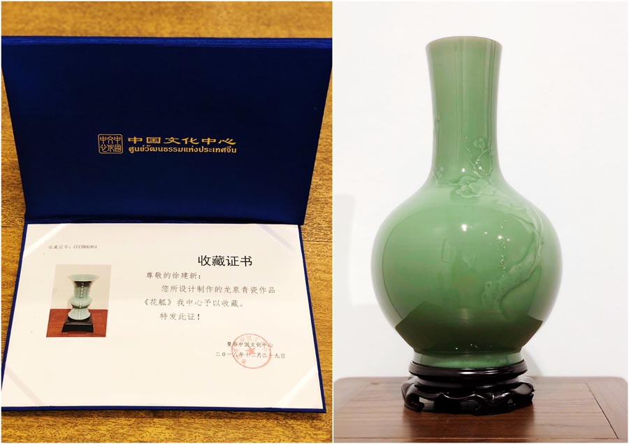 An art piece of Longquan celadon created by Chinese artist Xu Jianxin is donated to the China Cultural Center on Dec 29, 2018. Longquan is a city in East China's Zhejiang province famous for its ancient green porcelain art. [Photo/Chinaculture.org]