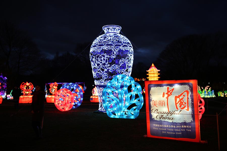 LED installations of pandas add fun to the first Winter Lantern Festival in New York on Dec 29, 2018. [Photo/Chinaculture.org]