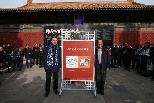Han Meilin(R) and Liu Aili chairman of China Post jointly unveil the Year of Pig stamps in Beijing. [Photo by Jiang Dong/China Daily] |
