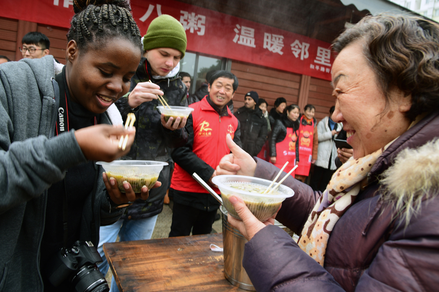 Jiangsu University students and villagers from Jinshan village in Zhenjiang city taste Laba porridge together on Jan 11. [Photo by Shi Yucheng/Asianewsphoto]