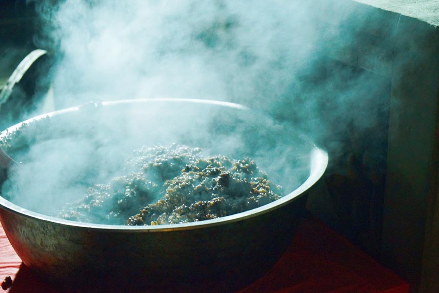 A big bowl of Laba porridge is ready to serve people waiting for a taste in Yuxian county, Zhangjiakou city, North China's Hebei province, Jan 13, 2019. [Photo by Wang Jingru/provided to chinadaily.com.cn]
