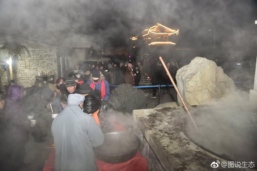 People line up for a bowl of Laba porridge at Sakya Temple in Yuxian county, Zhangjiakou city, North China's Hebei province, Jan 13, 2019. [Photo by Sun Ge/provided to chinadaily.com.cn]