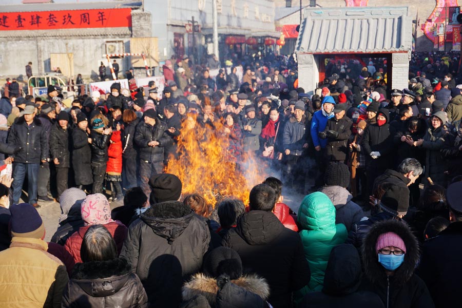 People bundle around a flaming charcoal fire to get warm on a chilly winter day, as well as offer blessings for the upcoming lunar New Year on Jan 13, 2019. [Photo by Li Ping/chinadaily.com.cn] |