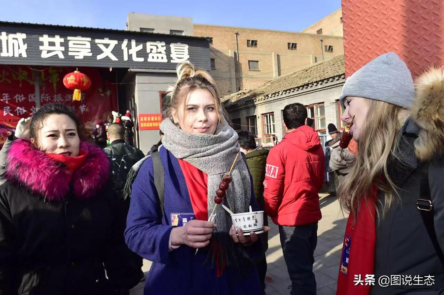 A foreign student tastes local delicacies at the festival, Jan 13, 2019. [Photo by Sun Ge/provided to chinadaily.com.cn]