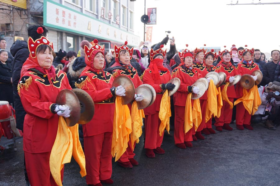 Traditional Chinese gong performers are pictured on Jan 13, 2019. [Photo by Li Ping/chinadaily.com.cn]