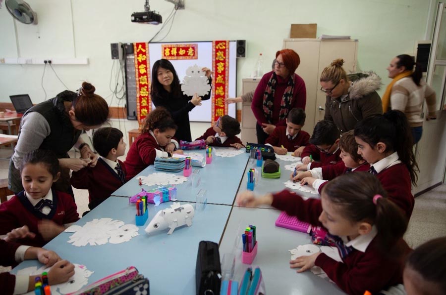 Artists from Taiwan introduce the Chinese zodiac to students at a primary school in Kalkara, Malta, Jan 10, 2019. China assigns an animal and its reputed attributes to each year in a repeating 12-year cycle, with 2019 the Year of the Pig. A new zodiac animal exhibition is underway at the China Cultural Center in Malta through Jan 25. [Photo/Chinaculture.org]