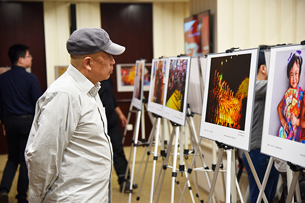 A visitor focuses on the award-winning photos of the 2018 "Sharing China - Happy Chinese New Year photo contest". [Photo by Zhang Xingjian/Chinaculture.org] |