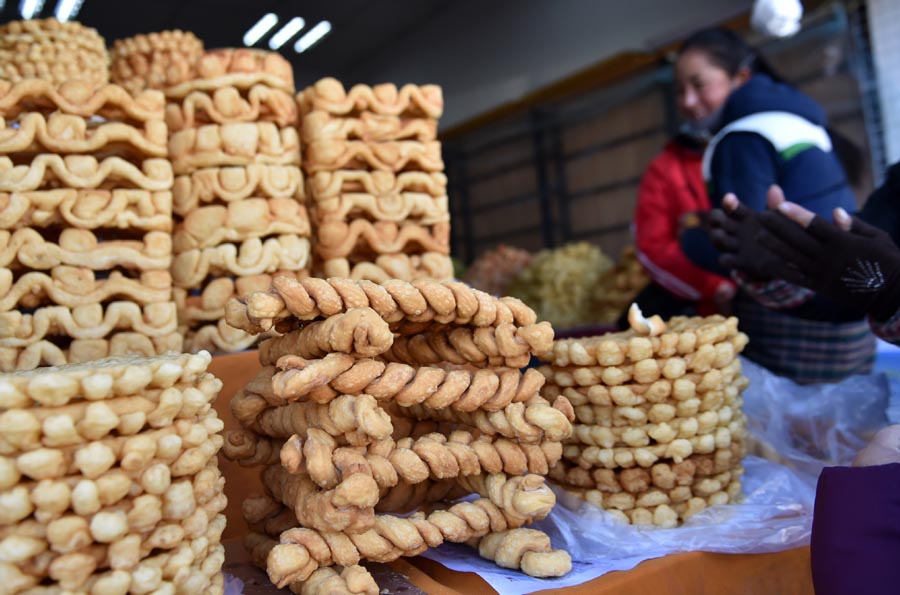 Tibetan pastry "khapse" is seen on the street of Lhasa, Jan 22, 2019. [Photo/Xinhua]