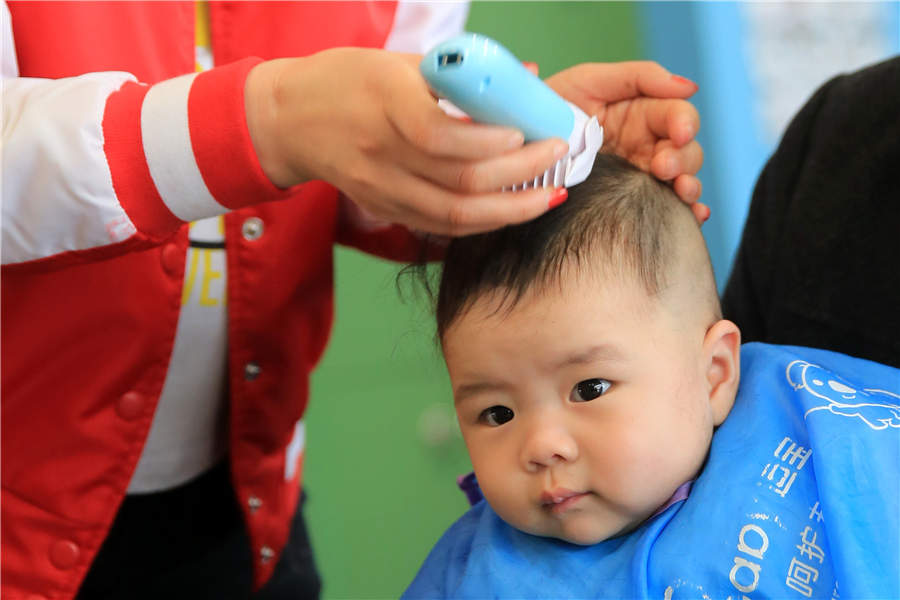 The photo shows a baby take a haircut at a barbershop. [Photo by Chao Ran/Asianewsphoto] |