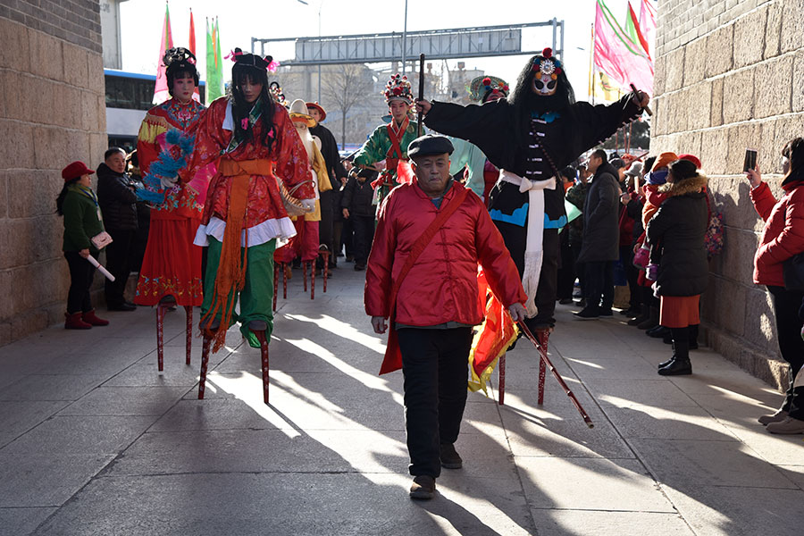 The traditional Chinese folk performance of stilt walking is seen at the Spring Festival celebration to welcome Xiaonian, or the Little Chinese New Year, held at the ancient Hefangkou Pass of Huaibei town, Huairou district, Beijing, on Jan 26. [Photo by Zhang Xingjian/chinadaily.com.cn]
