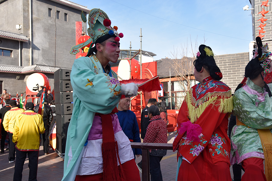 The traditional Chinese folk performance of stilt walking is seen at the Spring Festival celebration to welcome Xiaonian, or the Little Chinese New Year, held at the ancient Hefangkou Pass of Huaibei town, Huairou district, Beijing, on Jan 26. [Photo by Zhang Xingjian/chinadaily.com.cn]