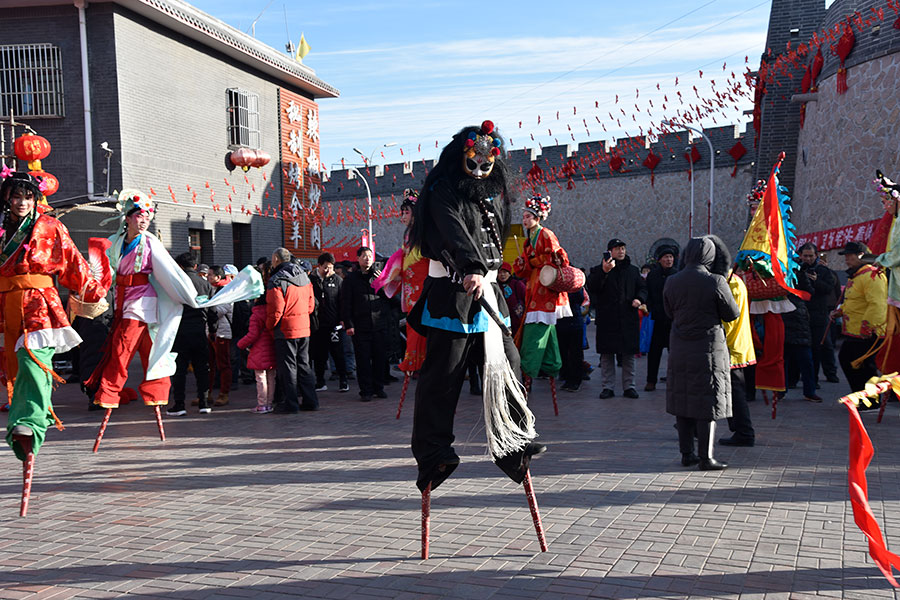 The traditional Chinese folk performance of stilt walking is seen at the Spring Festival celebration to welcome Xiaonian, or the Little Chinese New Year, held at the ancient Hefangkou Pass of Huaibei town, Huairou district, Beijing, on Jan 26. [Photo by Zhang Xingjian/chinadaily.com.cn]