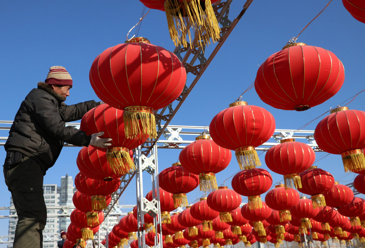 A worker settles red lanterns to greet the upcoming Spring Festival at the People's Park in Boxing County of Binzhou, East China's Shandong province, Jan 26, 2019. The Spring Festival, or the Chinese Lunar New Year, falls on Feb 5 this year. [Photo/Xinhua]