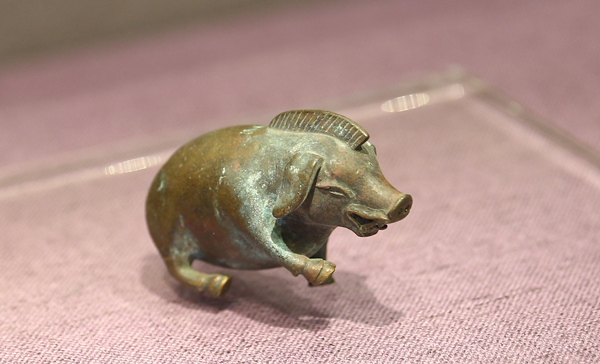 A pig figurine from the Qing Dynasty (1644-1911) is on display at the exhibition. [Photo by ZOU HONG/CHINA DAILY] |