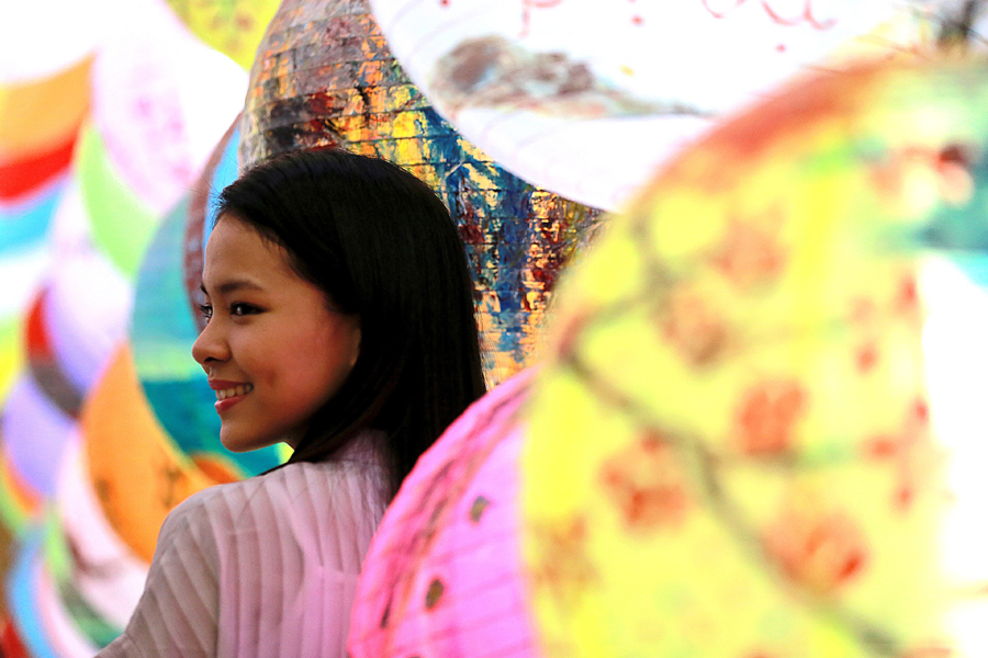 A girl poses among lantern decorations at the Chinatown in Manila, the Philippines, Feb 2, 2019. The Chinese Lunar New Year falls on Feb 5 this year. [Photo/Xinhua]