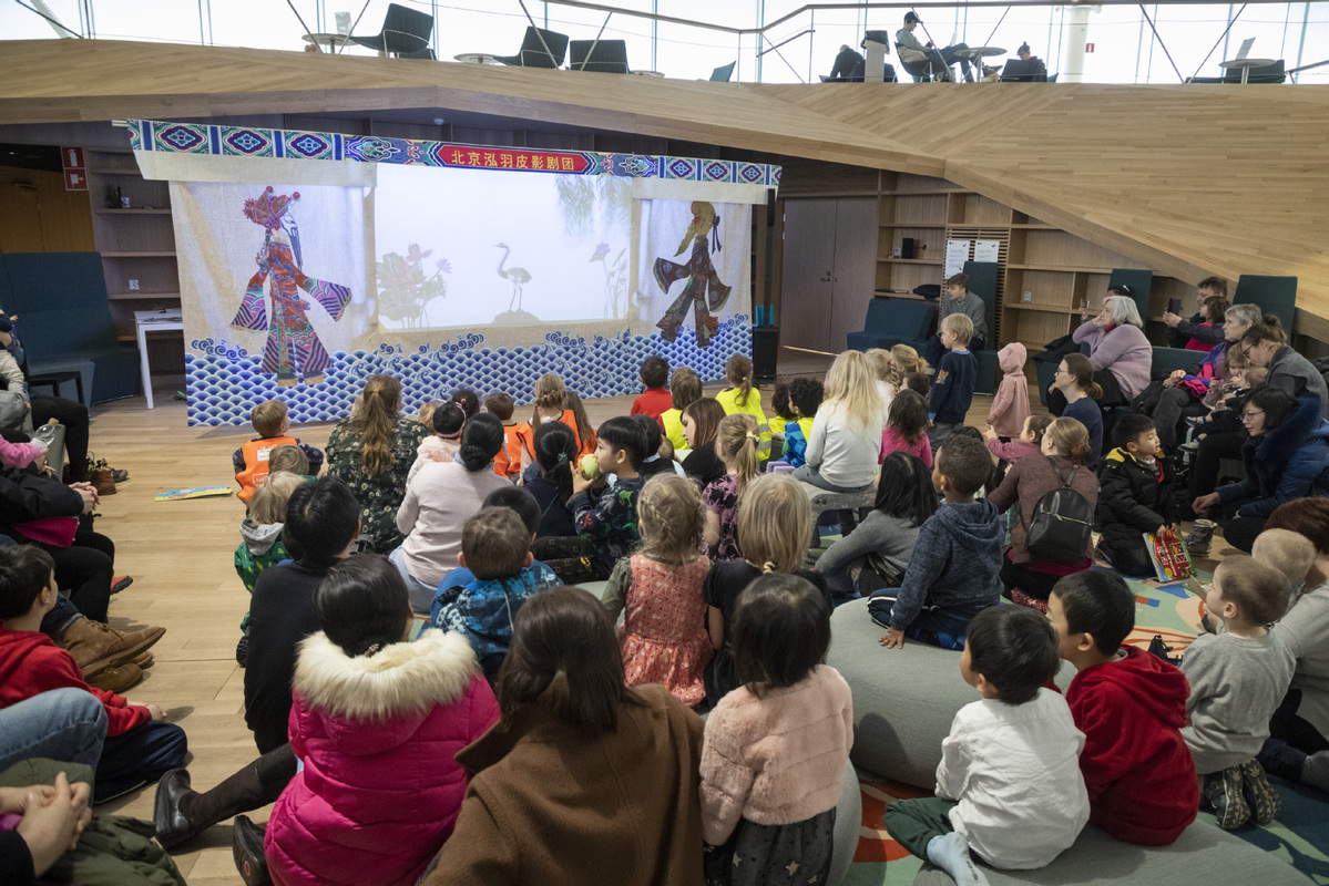 People watch a shadow puppet show at the prestigious Civic Square in Helsinki, Feb 4, 2019. [Photo/Xinhua] |