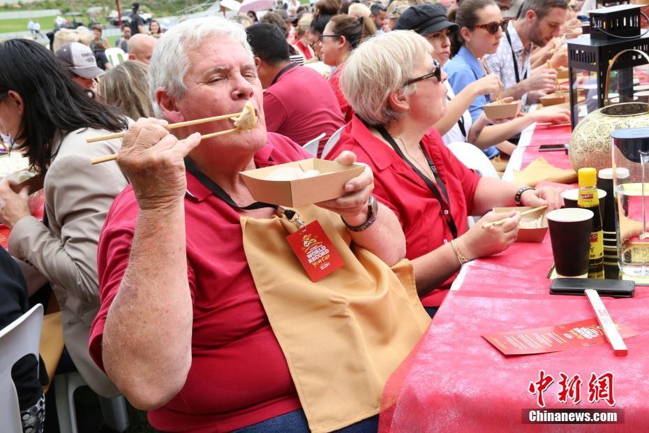 Participants eat dumplings, or jiaozi, in an event to celebrate the Chinese Lunar New Year in Sydney, Feb 5, 2019. A total of 764 people took part in the event, creating a new Guinness record for the number of people eating dumplings at the same time at the same place. The previous record was 750 in 2013 in Melbourne. [Photo/chinanews.com]