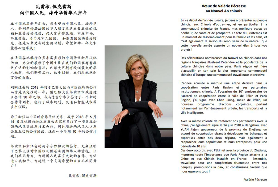 Valerie Pecresse sends a greeting letter in Chinese and French for Spring Festival. |