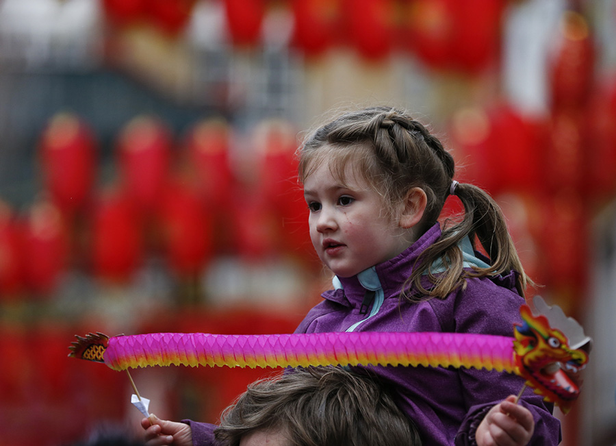A girl watches a Chinese Lunar New Year parade in London, Britain, on Feb 10, 2019. London hosted on Sunday one of the largest Chinese New Year celebrations outside Asia, drawing tens of thousands of visitors to the heart of the British capital to share the joy. The celebration began with a grand parade featuring 30 teams including a Chinese Dragon and Lion team, an iconic London double-decker bus and a variety of floats streaming through the streets from Trafalgar Square, via West End before reaching its final destination Chinatown. [Photo/Xinhua]