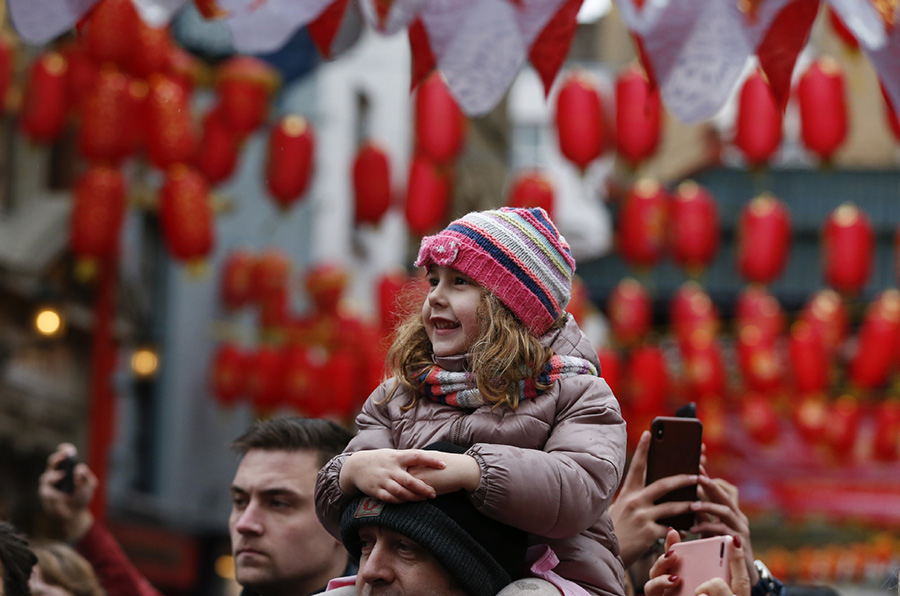 A girl watches a Chinese Lunar New Year parade in London, Britain, on Feb 10, 2019. London hosted on Sunday one of the largest Chinese New Year celebrations outside Asia, drawing tens of thousands of visitors to the heart of the British capital to share the joy. The celebration began with a grand parade featuring 30 teams including a Chinese Dragon and Lion team, an iconic London double-decker bus and a variety of floats streaming through the streets from Trafalgar Square, via West End before reaching its final destination Chinatown. [Photo/Xinhua] |