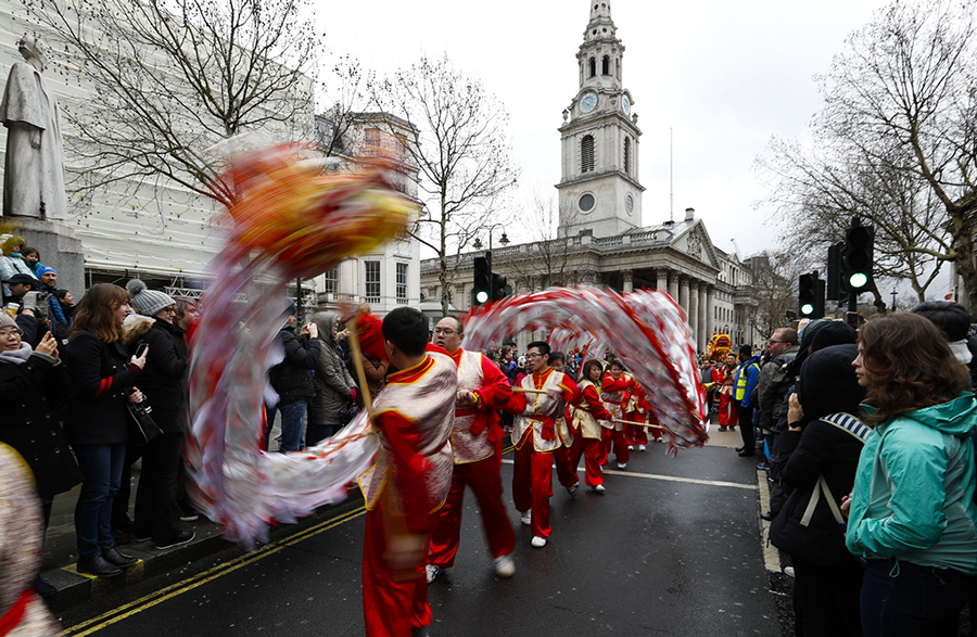 People perform the dragon dance during a Chinese Lunar New Year parade in London, Britain, on Feb 10, 2019. London hosted on Sunday one of the largest Chinese New Year celebrations outside Asia, drawing tens of thousands of visitors to the heart of the British capital to share the joy. The celebration began with a grand parade featuring 30 teams including a Chinese Dragon and Lion team, an iconic London double-decker bus and a variety of floats streaming through the streets from Trafalgar Square, via West End before reaching its final destination Chinatown.[Photo/Xinhua]