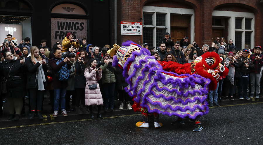 People take photos of the lion dance performance during a Chinese Lunar New Year parade in London, Britain, on Feb 10, 2019. London hosted on Sunday one of the largest Chinese New Year celebrations outside Asia, drawing tens of thousands of visitors to the heart of the British capital to share the joy. The celebration began with a grand parade featuring 30 teams including a Chinese Dragon and Lion team, an iconic London double-decker bus and a variety of floats streaming through the streets from Trafalgar Square, via West End before reaching its final destination Chinatown. [Photo/Xinhua]