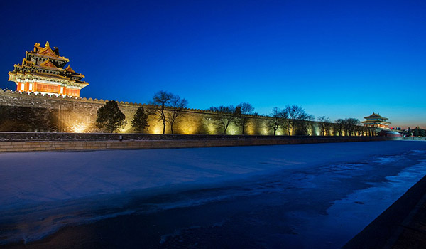 Night view of the Palace Museum's turret after snow in Beijing, February 8, 2014. [Photo/CGTN] |