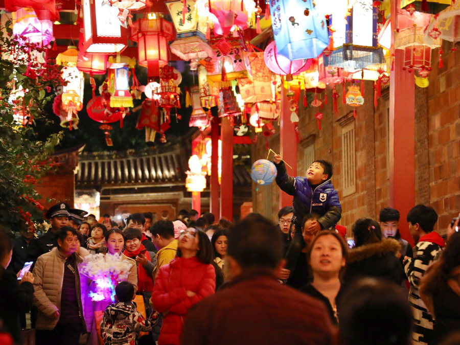 Visitors view the lanterns in Wudianshi Traditional Blocks, Jinjiang city, East China's Fujian province on Feb 17, 2019. [Photo/Xinhua] |