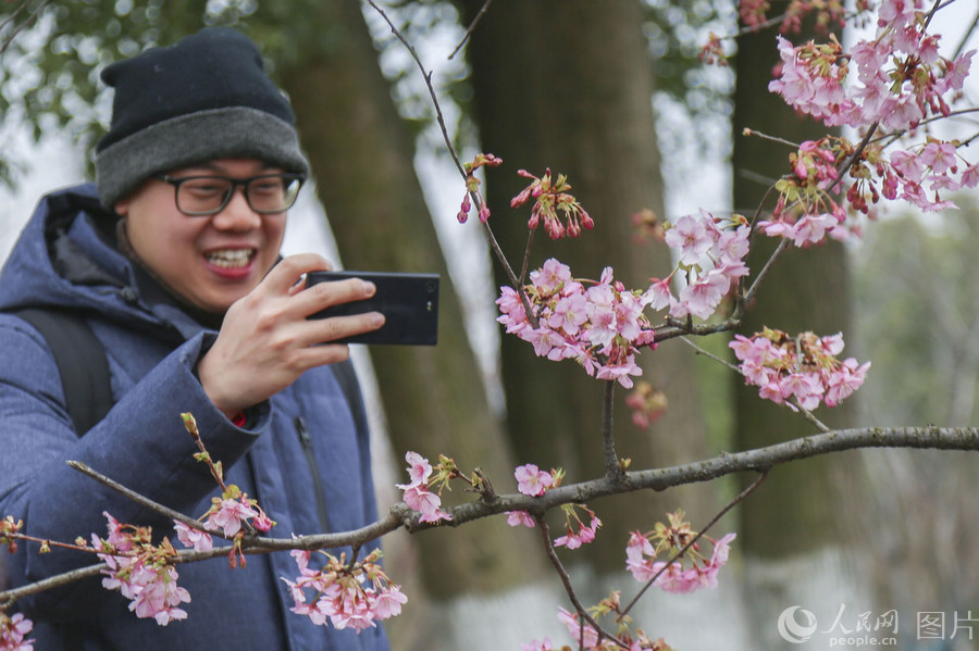 A visitor takes photos of blooming cherry flowers at Gucun Park in Shanghai on Feb 28, 2019. [Photo/people.cn]