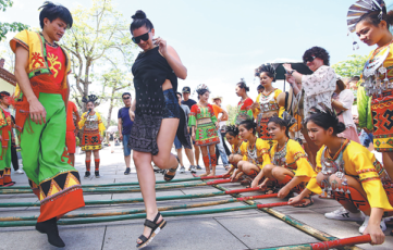 A foreign visitor joins locals in a bamboo pole dance. [Photo provided to China Daily] |