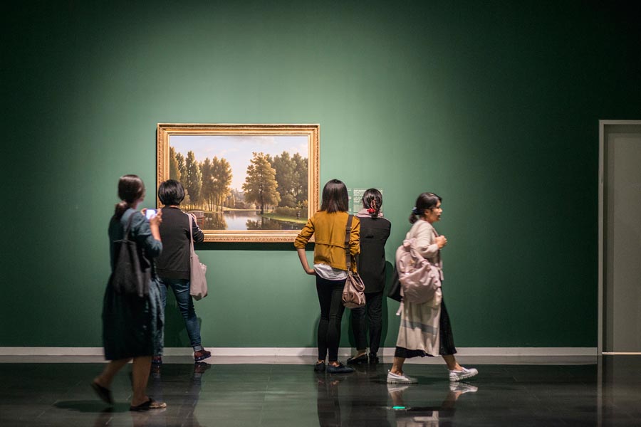 Visitors stop to look at a painting at the exhibition, which shows 50 landscapes and reviews the influence European masters had on US painters. [Photo provided to China Daily] |