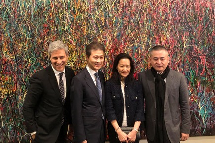 From left: Michael Govan, CEO of the Los Angeles County Museum of Art, Chinese-American banker Dominic Ng and his wife Ellen Ng and Chinese artist Zeng Fanzhi attend an event where the museum announced the purchase of Zeng's painting Untitled (2018) for its permanent collection. [PHOTO BY ZHANG SHUO/CHINA NEWS SERVICE] |