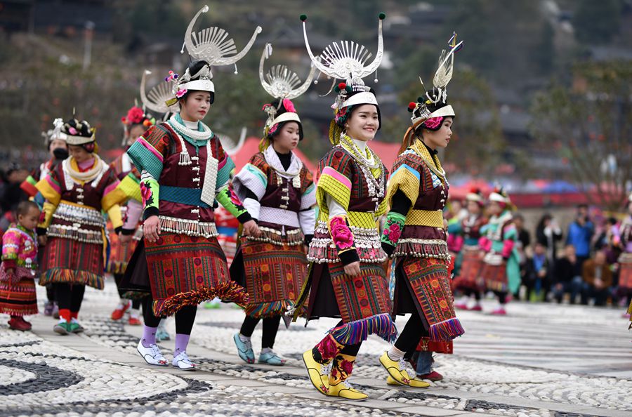 With colorful costumes and silver accessories, girls of the Miao ethnic group in Southwest China's Guizhou province celebrated their traditional Fangu Festival on Saturday with drums and dances. Boasting a history of more than 600 years, the festival is as much about welcoming spring as praying for a rich harvest during the upcoming plowing season.