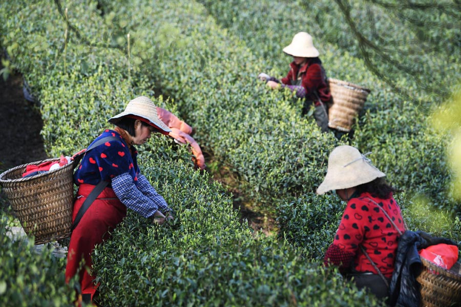 Workers pick tea leaves at a farm in Southwest China's Chongqing on March 18, 2019. [Photo/Xinhua]