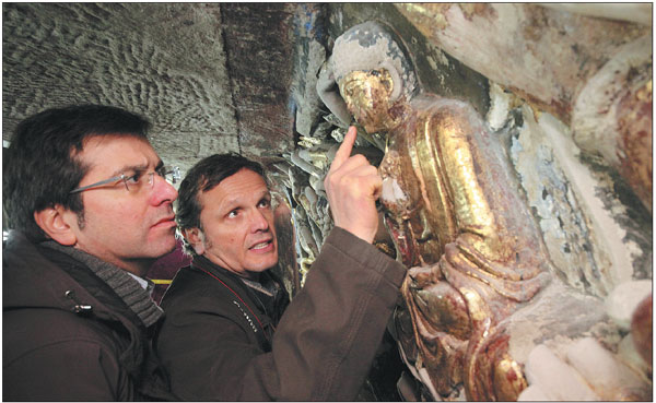 Italian experts help to restore statues of Bodhisattva of Mercy at a temple in Chongqing. [Photo by Luo Jiaguo/For China Daily] |