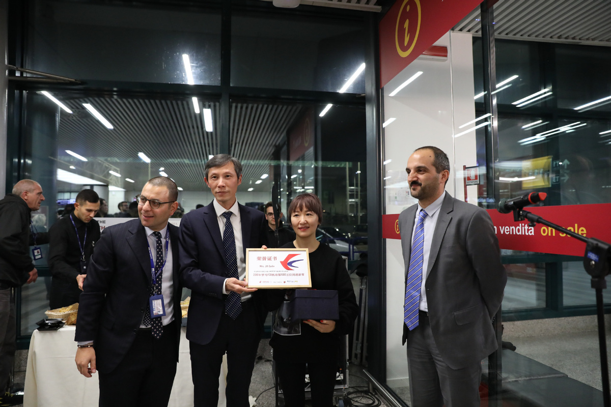 A Chinese female tourist (second right) becomes the 15th million visitor from China in 2018, at the Fiumicino Airport in Rome, Italy, December 28, 2018. Italy has become one of the most popular European countries for Chinese tourists. [Photo/ Xinhua]
