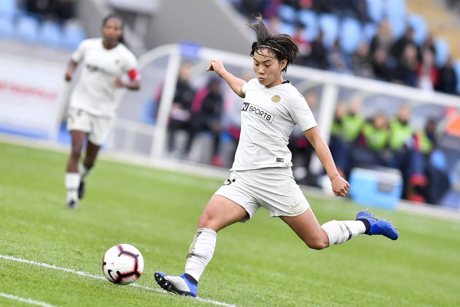 Chinese women's footballer Wang Shuang, currently playing for French club Paris Saint-Germain, shoots during a match between Paris Saint-Germain and Lille in Lille, France, Jan 13, 2019. [Photo/Xinhua]